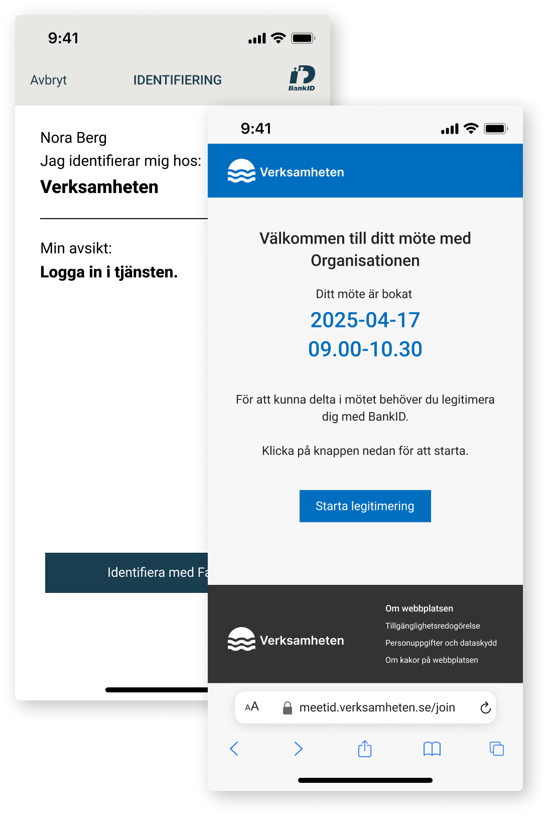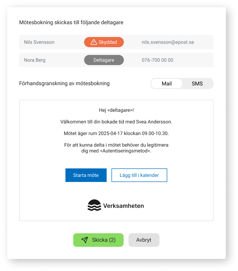 Deltagaren möter organisationens egen mötestjänst – från inbjudan, domän och visuellt uttryck till autentisering. Även i ex. BankID signerar användaren mot rätt part med er identitet som mottagare.